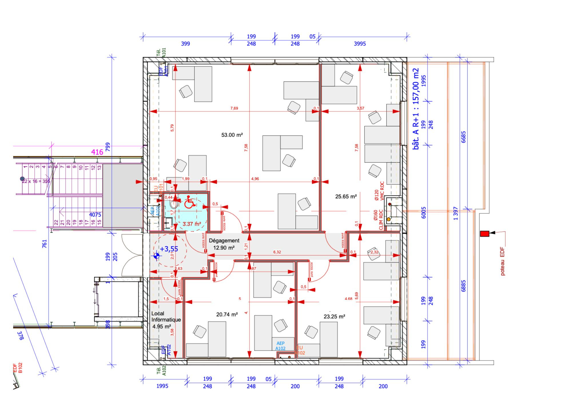 Avec une superficie de 148 m², ce local moderne offre un cadre de travail confortable et fonctionnel. Entièrement cloisonnés et climatisés, ils allient praticité et bien-être pour vos équipes comme pour vos clients. Situés au premier étage avec ascenseur, les locaux sont accessibles aux personnes à mobilité réduite.
