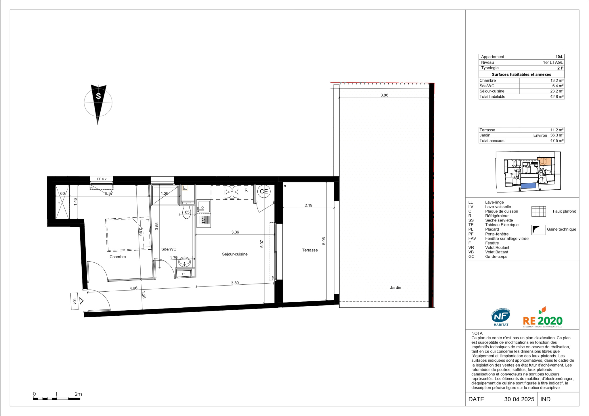 L’appartement se compose d’un séjour-cuisine lumineux de 23 m², d’une chambre, d’une salle d’eau avec WC, ainsi que d’une terrasse de 11,2 m² prolongée par un jardin privatif de 36,3 m².