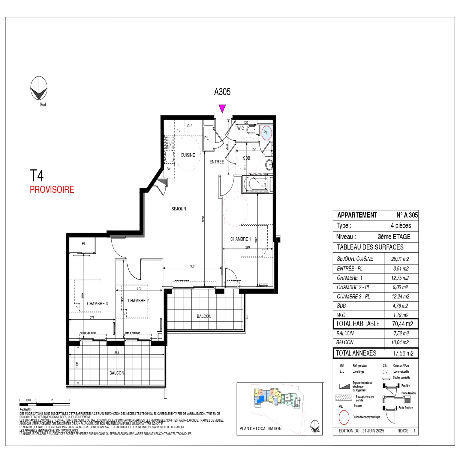 Dans une résidence neuve et sécurisée, découvrez ce bel appartement de type 4 situé au troisième et dernier étage, d’une surface habitable de 70,44 m². Le séjour-cuisine de 27 m² s’ouvre sur un premier balcon de 7,52 m². Deux chambres donnent accès à un second balcon de 10,04 m², tandis que la troisième chambre bénéficie elle aussi d’une ouverture sur le balcon relié au séjour. Ainsi, toutes les chambres disposent d’un accès extérieur, offrant une belle luminosité et un confort de vie rare.