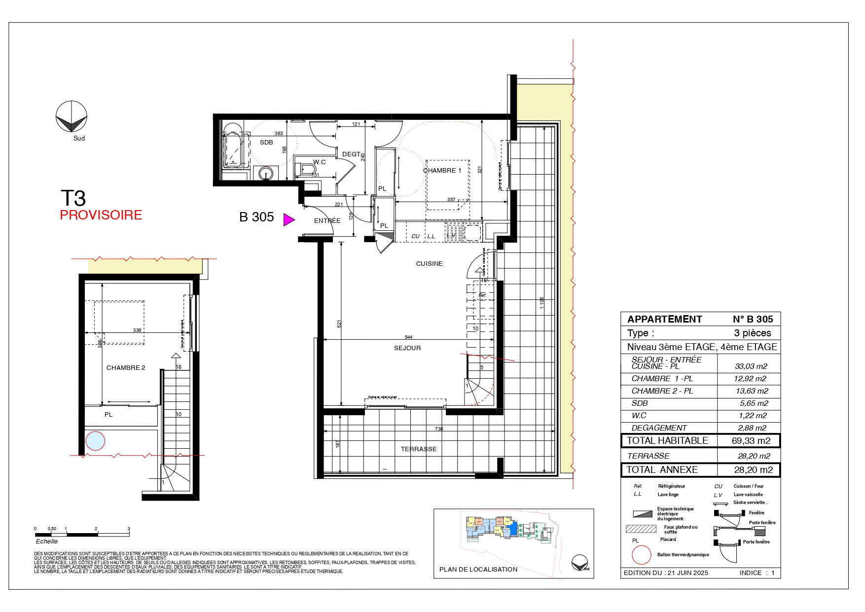 Dans une résidence neuve et sécurisée, découvrez ce bel appartement de type 3 en duplex situé au troisième et dernier étage, offrant une surface habitable de 69 m². L’espace de vie comprend un séjour-cuisine lumineux prolongé par une terrasse d’angle exceptionnelle de 28,20 m², idéale pour profiter de l’extérieur en toute saison.