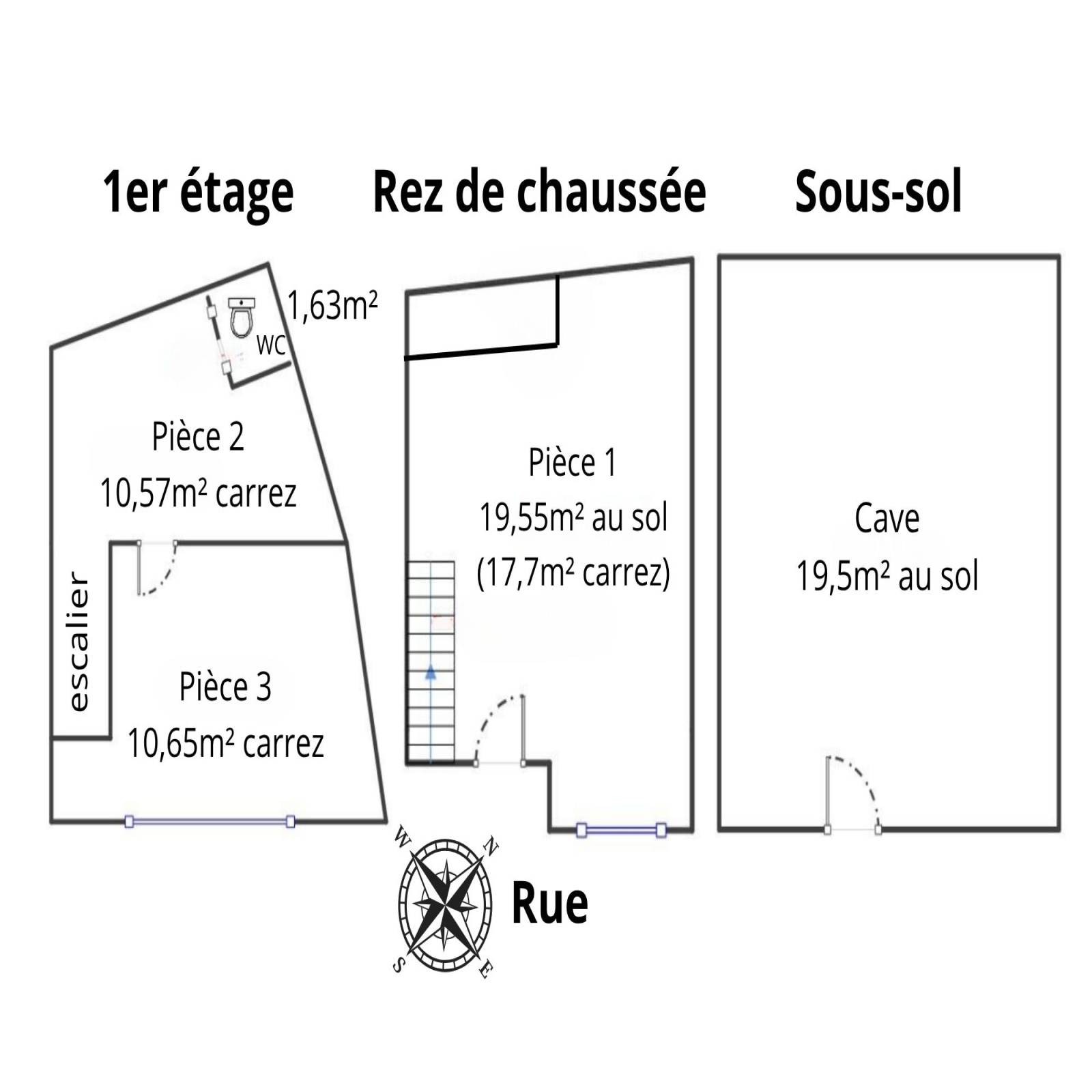 - Au premier étage avec accès par escalier : 2 pièces de 10,57m² et 10,65m² dont une donnant avec fenêtre sur rue plus un WC de 1,63m²,