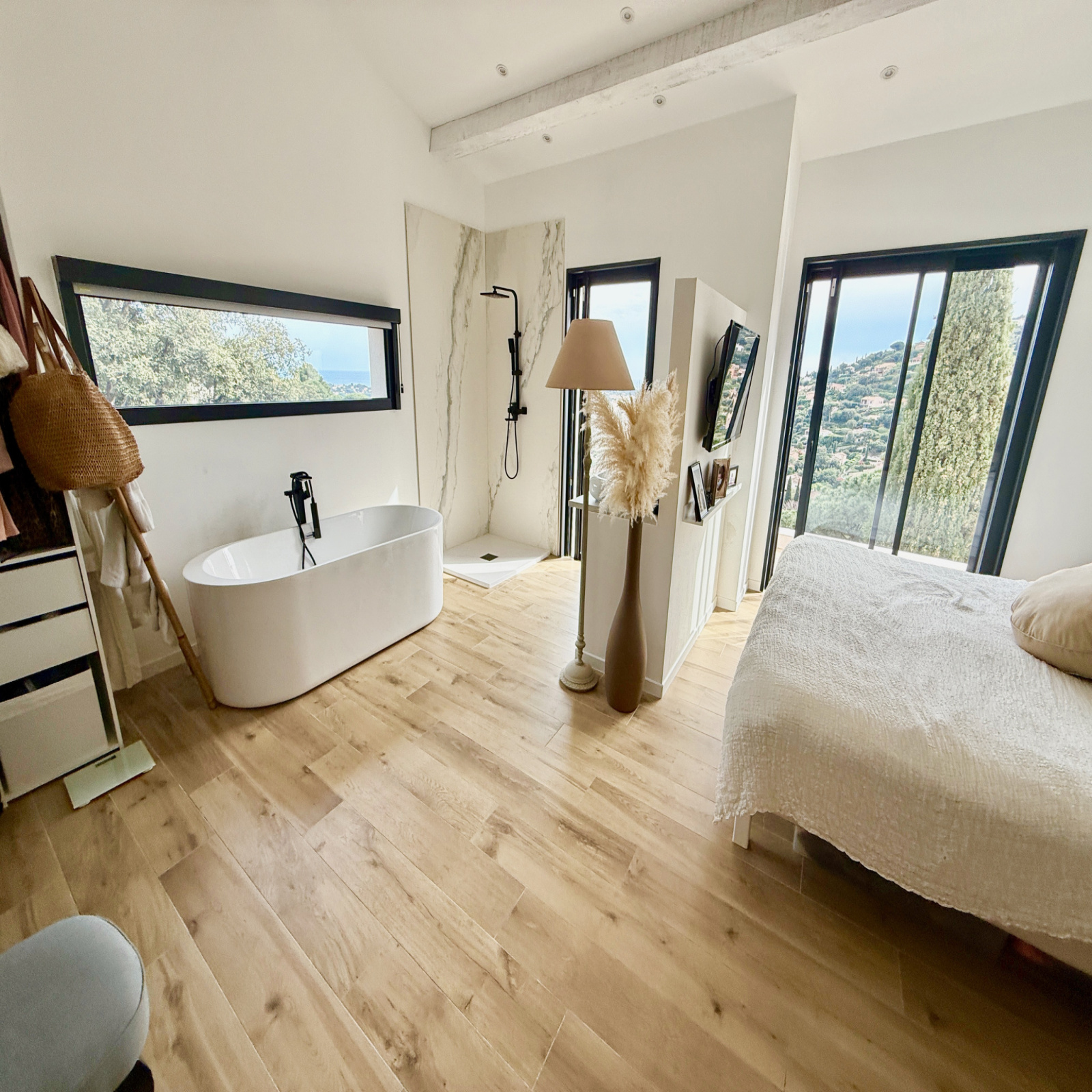 Séjour lumineux avec cuisine ouverte, suite parentale avec terrasse privative vue mer, deux chambres et salles d’eau. Appartement indépendant.