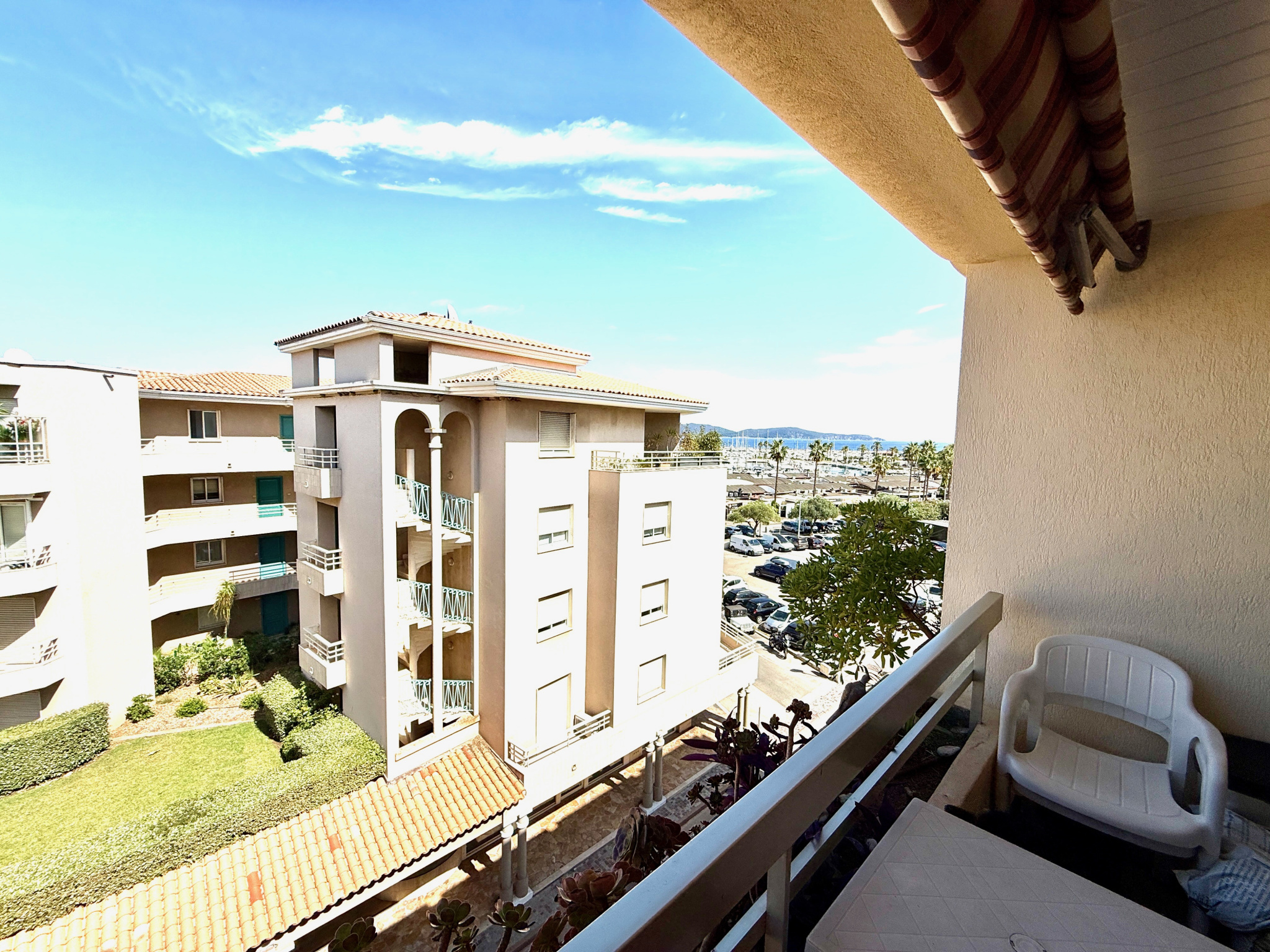 La terrasse dévoile une vue sur la baie de Cavalaire, le port et le Cap Lardier.