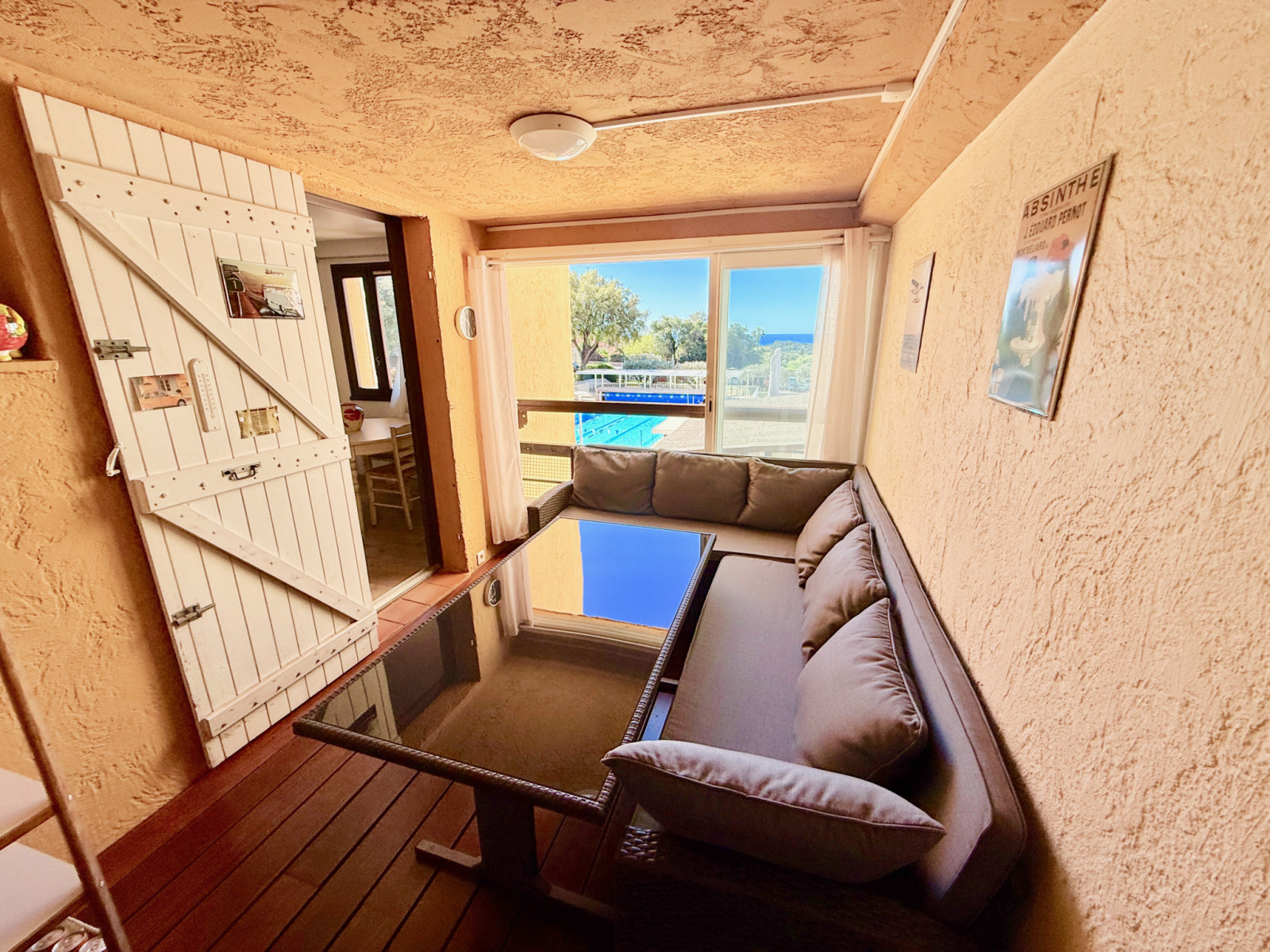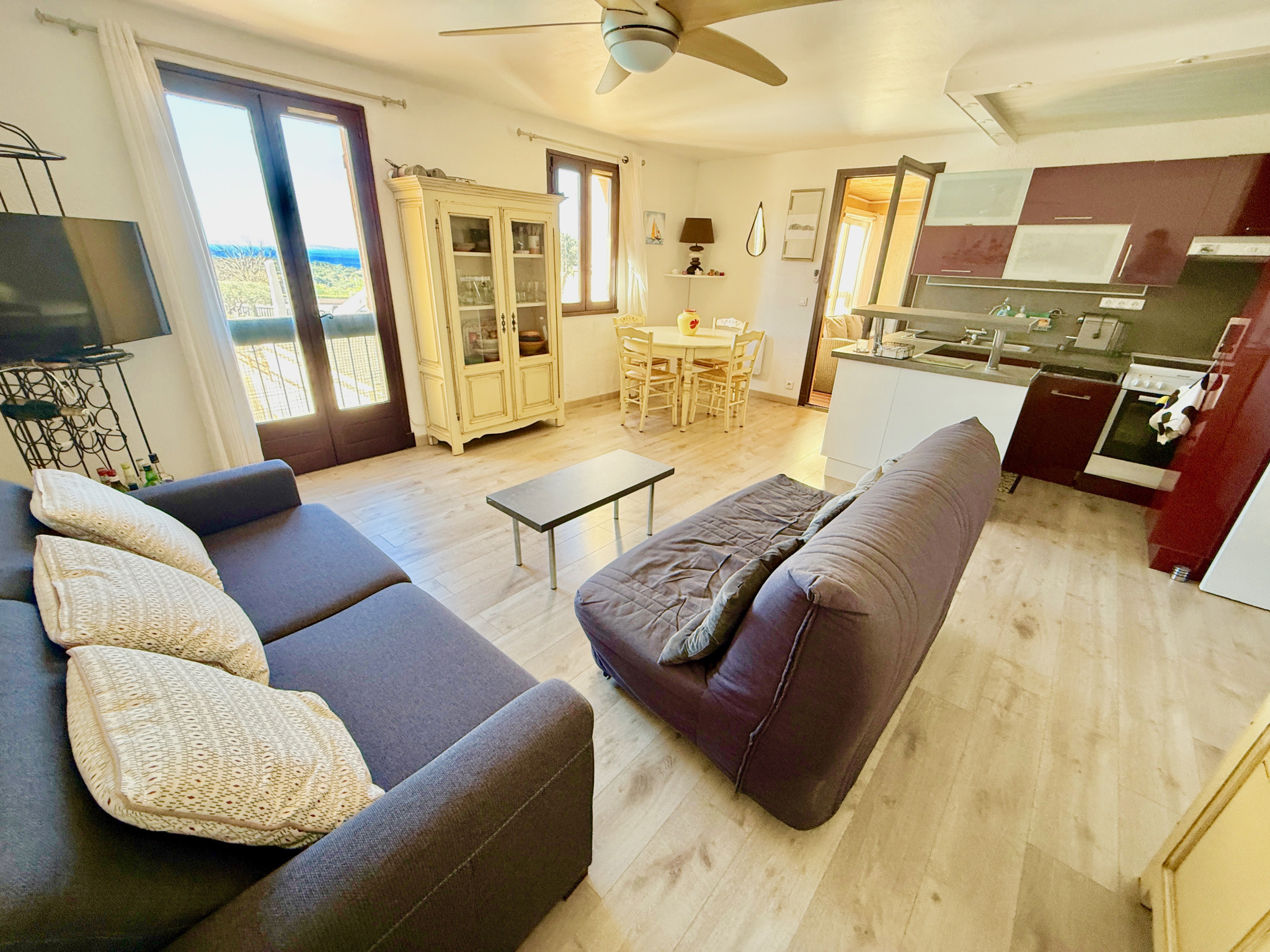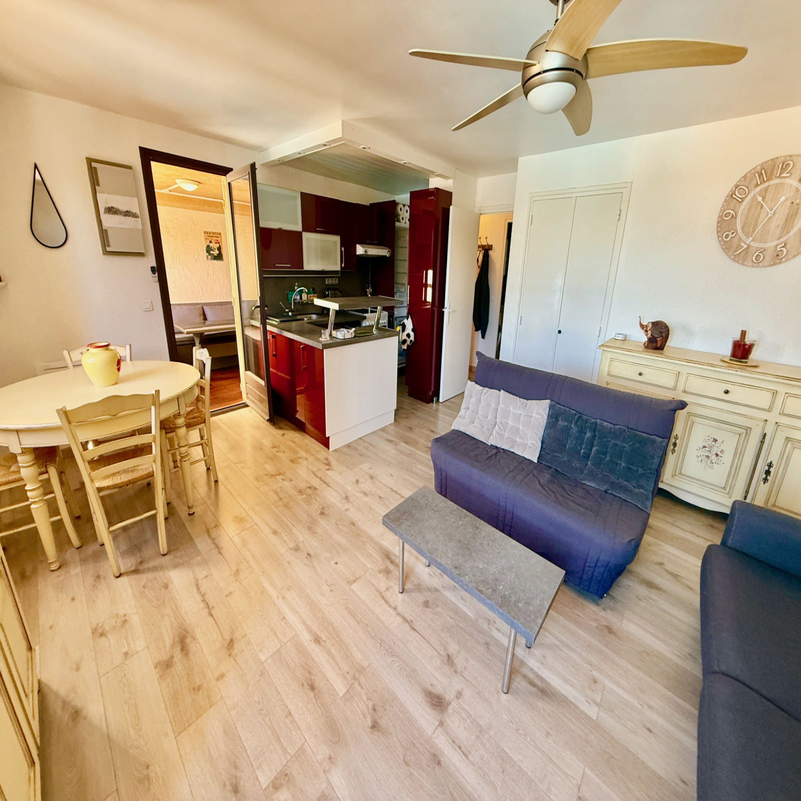 L’entrée se fait par une spacieuse loggia vitrée avec vue mer, véritable extension du séjour. L’appartement comprend un salon avec cuisine ouverte équipée, une chambre avec placard, une salle de bains et des WC séparés.