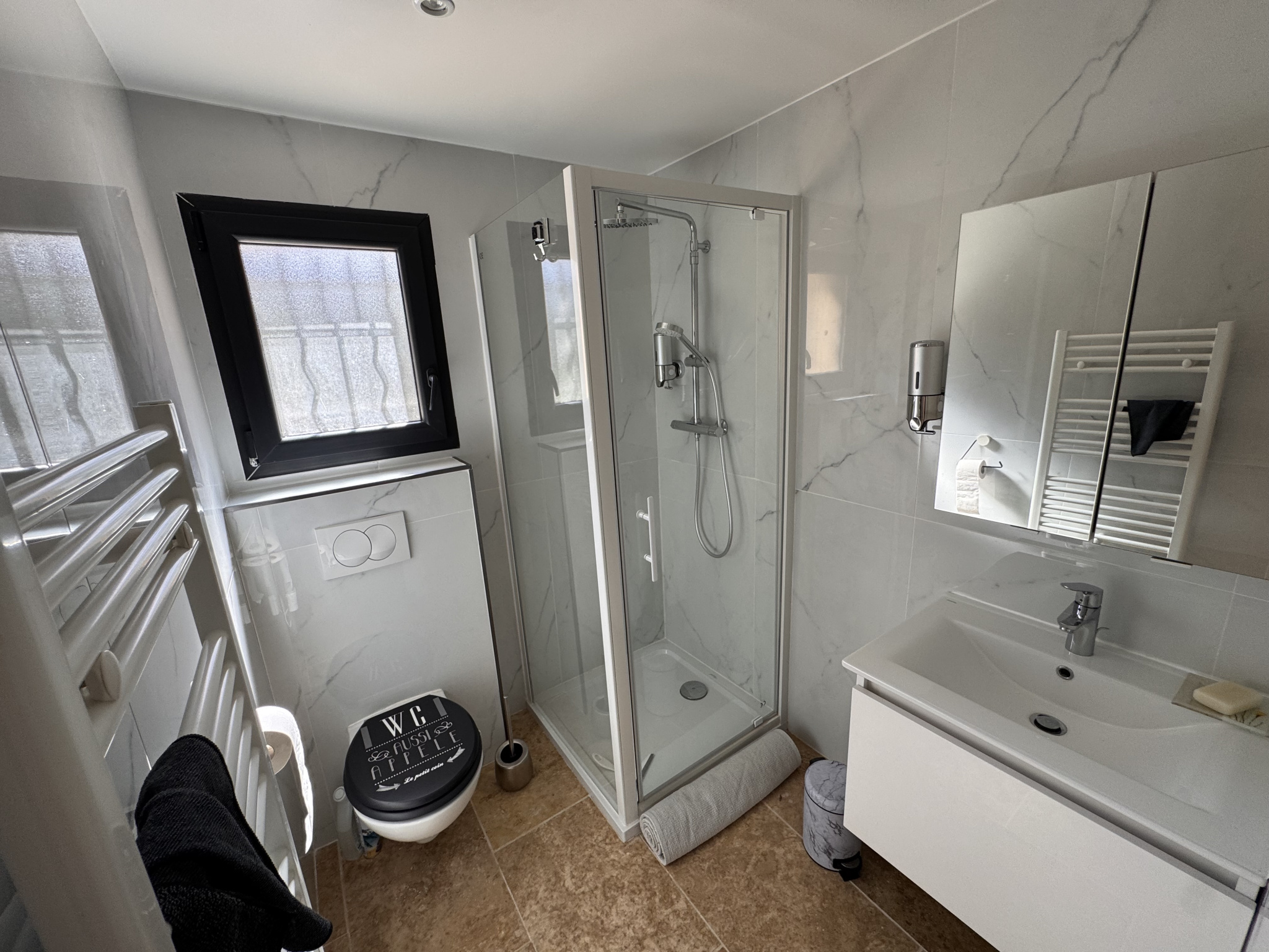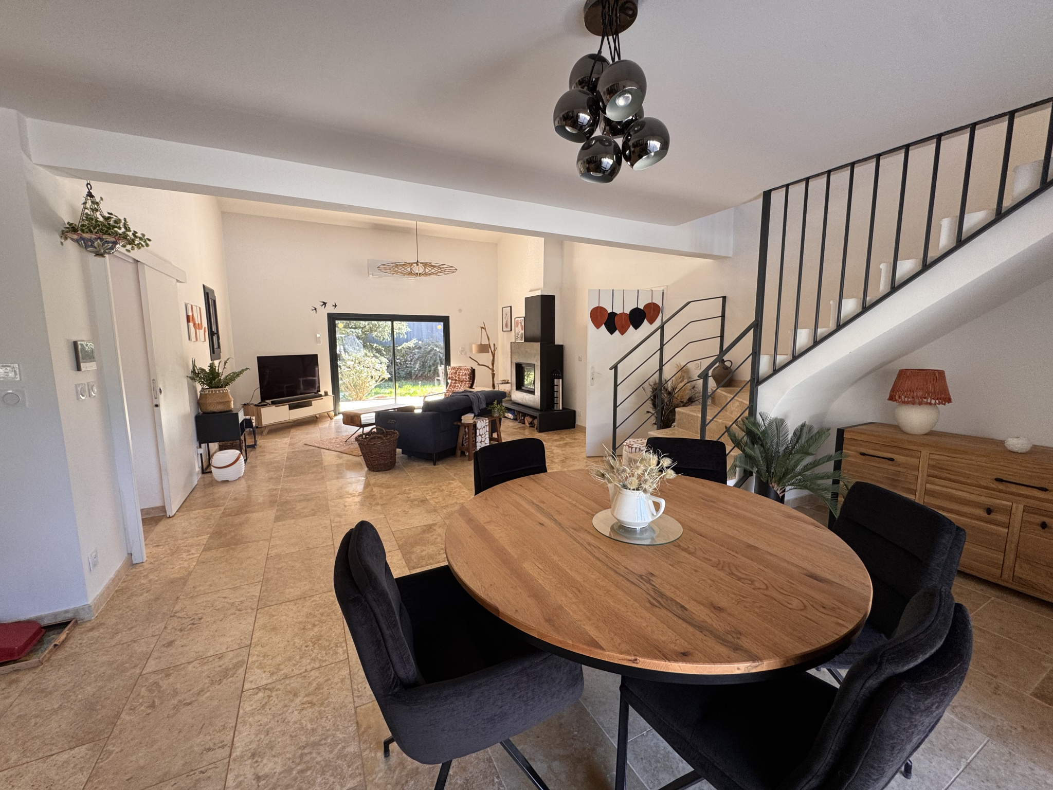 Dès l’entrée, vous serez séduit par ses volumes et sa luminosité. Le rez-de-chaussée propose une entrée avec rangements, un vaste séjour / salle à manger de 45 m² équipé d’une cheminée avec insert et d’une climatisation réversible, ainsi qu’une cuisine entièrement aménagée et équipée avec plaque à induction, dont la majorité des équipements reste en place. L’espace nuit se répartit intelligemment avec, d’un côté, une chambre disposant de sa salle d’eau et de WC, et de l’autre, deux chambres supplémentaires accompagnées d’une salle de bains complète avec baignoire, douche et WC.
