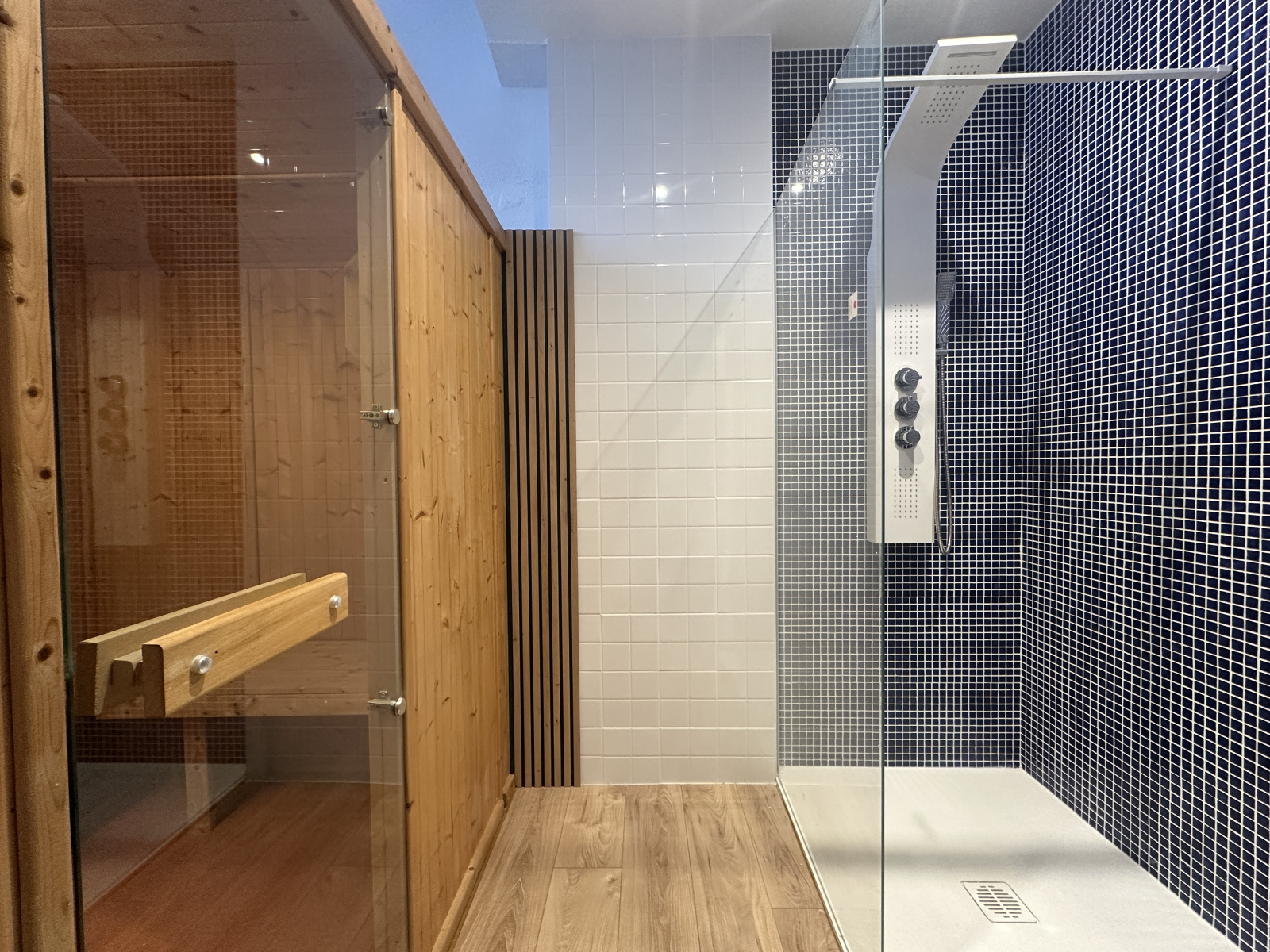 Il est composé également de 2 chambres dont une avec balcon, d'une salle d'eau indépendante avec douche et un sauna intégré permettant de vous prélasser, d'une pièce d'eau avec wc et grande vasque.