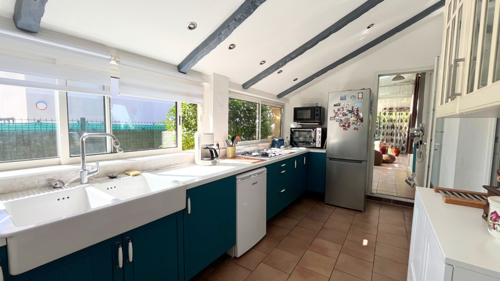 une cuisine indépendante équipée aménagée,un vaste séjour double,une véranda lumineuse donnant sur le jardin, deux chambres,1 coin bureau,1 salle d'eau,1 wc indépendant.