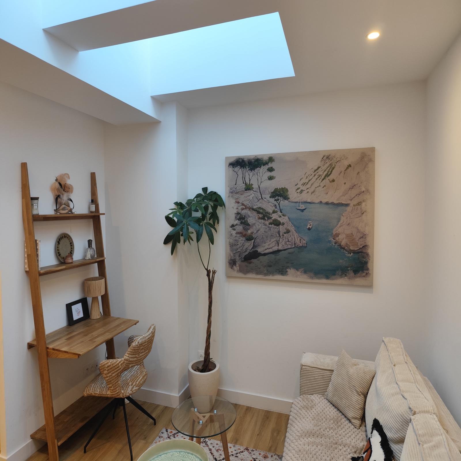 Deux grands puits de lumière inondent l’espace toute la journée, créant une atmosphère chaleureuse, protégée, sans vis-à-vis. Un havre de paix, à l’abri des regards.