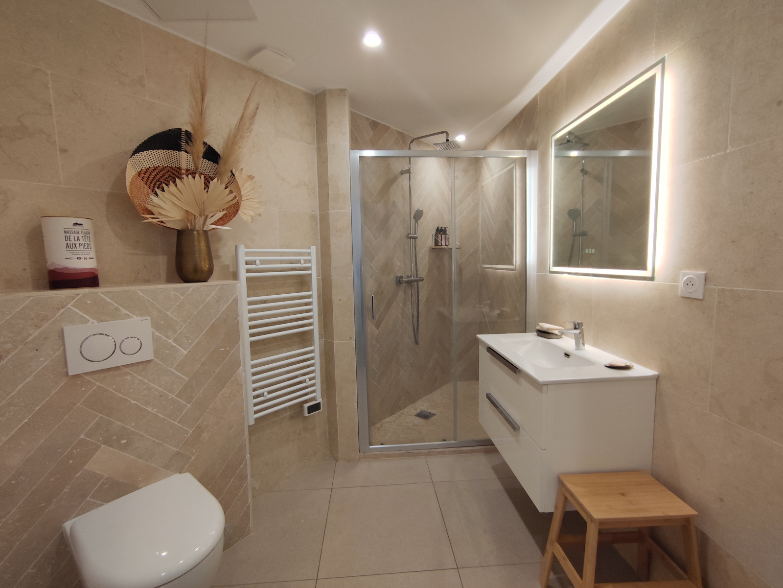 La salle d’eau, rénovée avec des matériaux de qualité, dispose d’une douche à l’italienne maçonnée et de revêtements en pierre naturelle, offrant une atmosphère sobre et élégante, propice au confort et au bien-être.