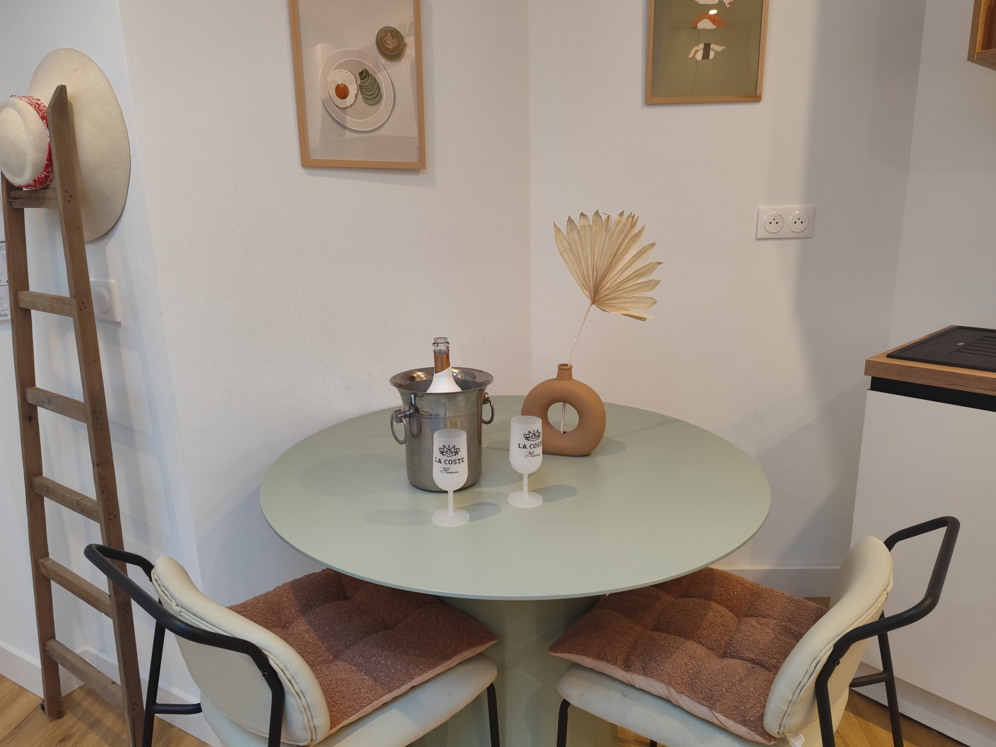 Vous serez enchanté par la douceur qui se dégage de la pièce à vivre (noblesse des matériaux et parquets, tonalités claires et harmonieuses, …) et le confort du coin cuisine tout équipé.