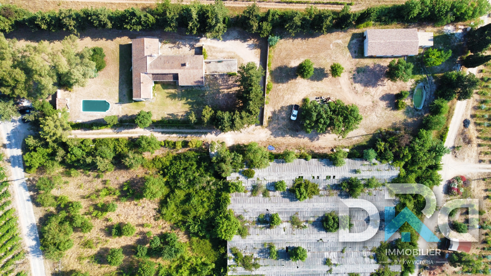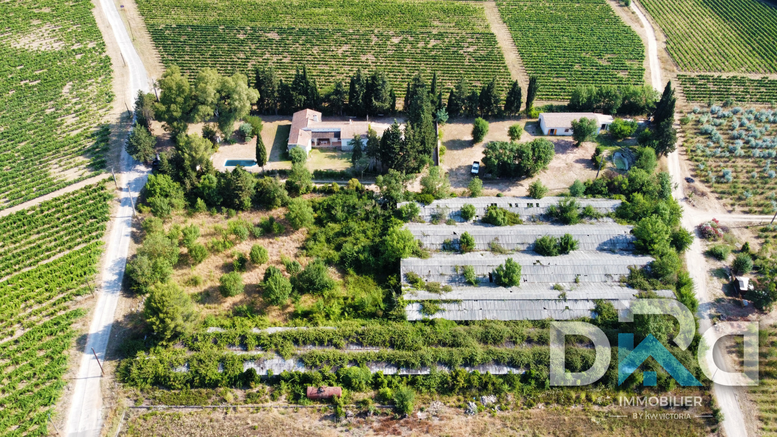 La maison est équipée d’une fosse septique et se situe en zone agricole, entourée de vignes.