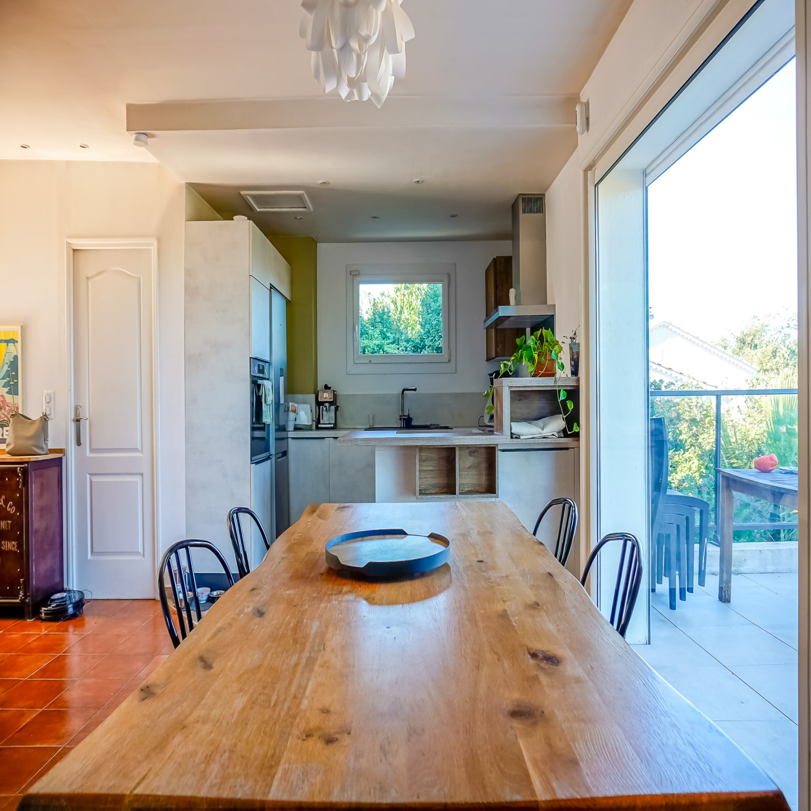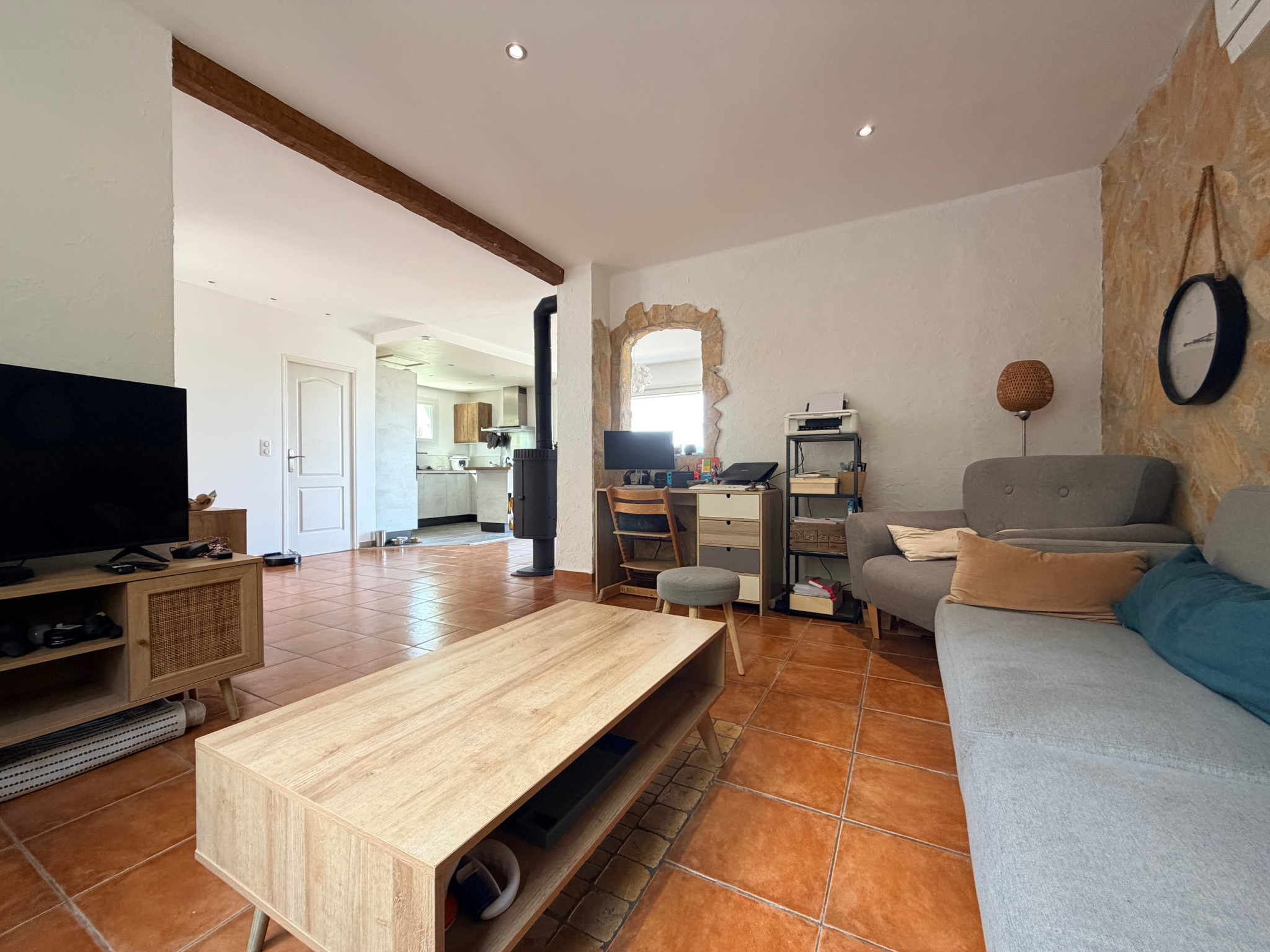 L’espace de vie se compose d’un séjour lumineux de 47 m² avec cuisine ouverte, poêle à bois et climatisation réversible. Il s’ouvre sur une agréable terrasse de 20 m², véritable atout pour profiter de l’extérieur tout au long de la journée, avec de belles lumières du lever au coucher du soleil et une vue dégagée imprenable sur La Crau. Une buanderie attenante complète cet espace de vie fonctionnel.