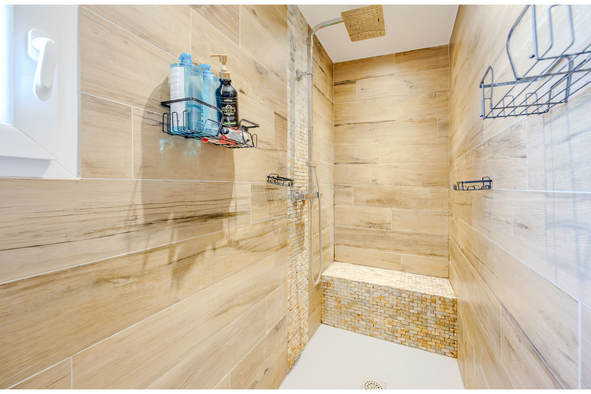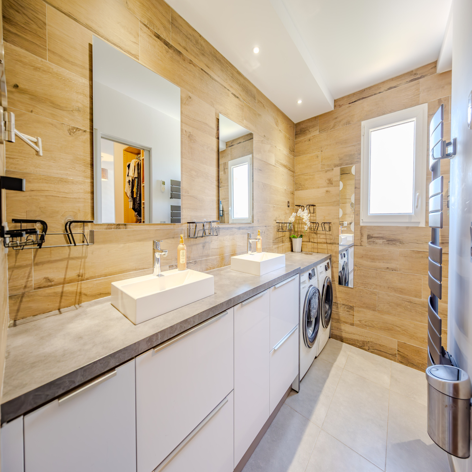 - Salle d’eau haut de gamme avec double vasque et douche à l’italienne