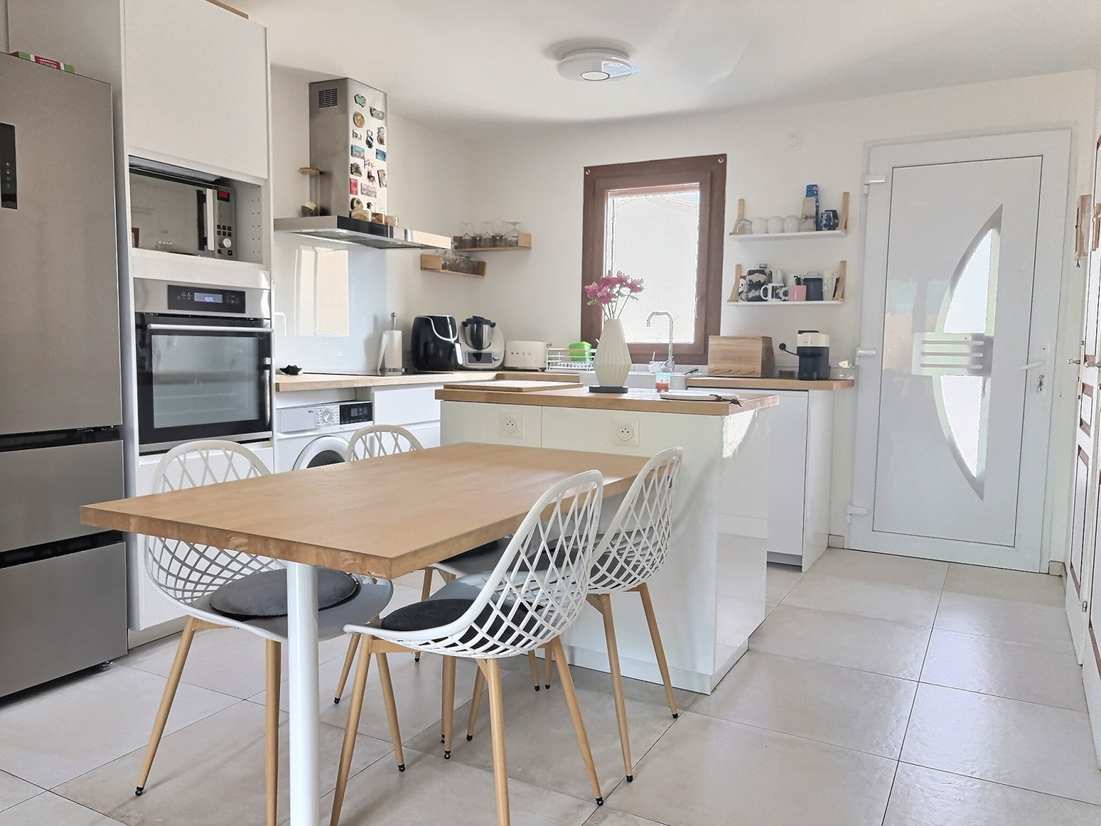 Rez-de-chaussée : grand séjour lumineux avec cuisine ouverte équipée, climatisation réversible, WC indépendant, local de rangement avec tableau électrique