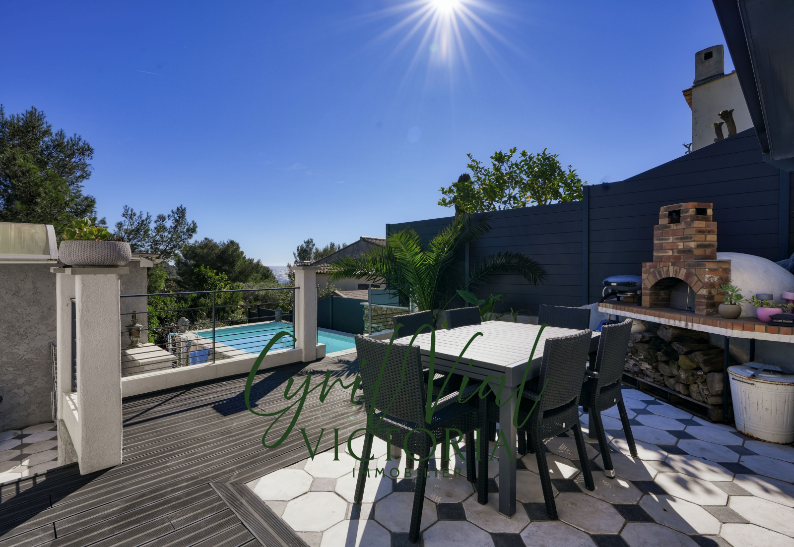 À l’étage, un second appartement de type T3 bénéficie de beaux volumes et d’un accès direct aux espaces extérieurs comprenant une cuisine d’été, une piscine et un plateau dominant avec vue sur la mer, permettant de profiter pleinement de l’environnement et du climat méditerranéen.