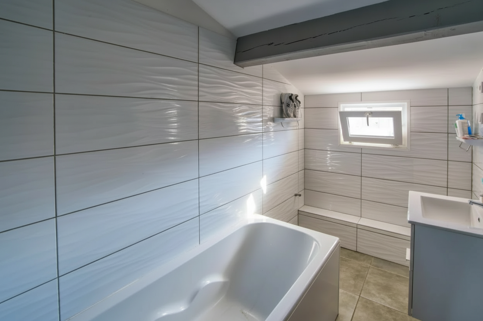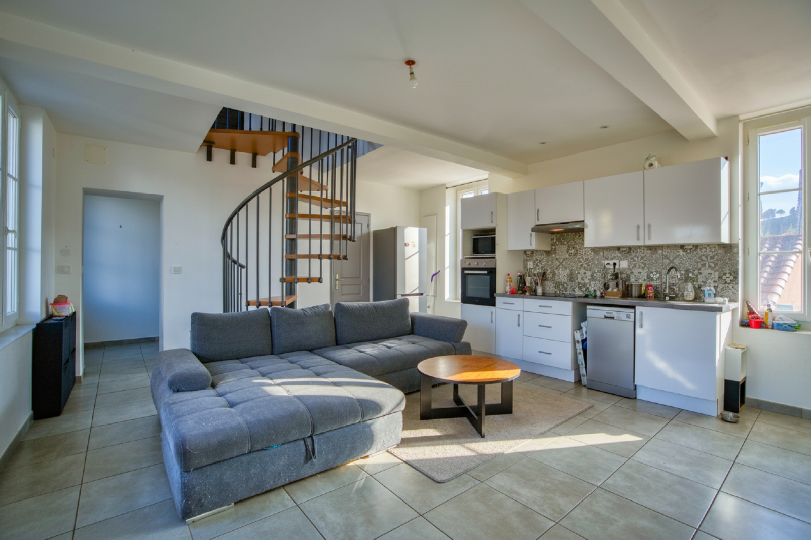 À l’étage, le duplex T3 d’environ 74 m² présente de beaux volumes et une distribution fonctionnelle : séjour, cuisine équipée, deux chambres, une salle de bains, une salle d’eau avec WC, ainsi qu’une buanderie et un dressing, offrant confort et rangements appréciables. Actuellement loué 1016€ hors charges.