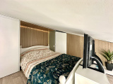 La mezzanine, aménagée en coin nuit, accueille un lit ainsi que de nombreux rangements, offrant une optimisation parfaite de l’espace.