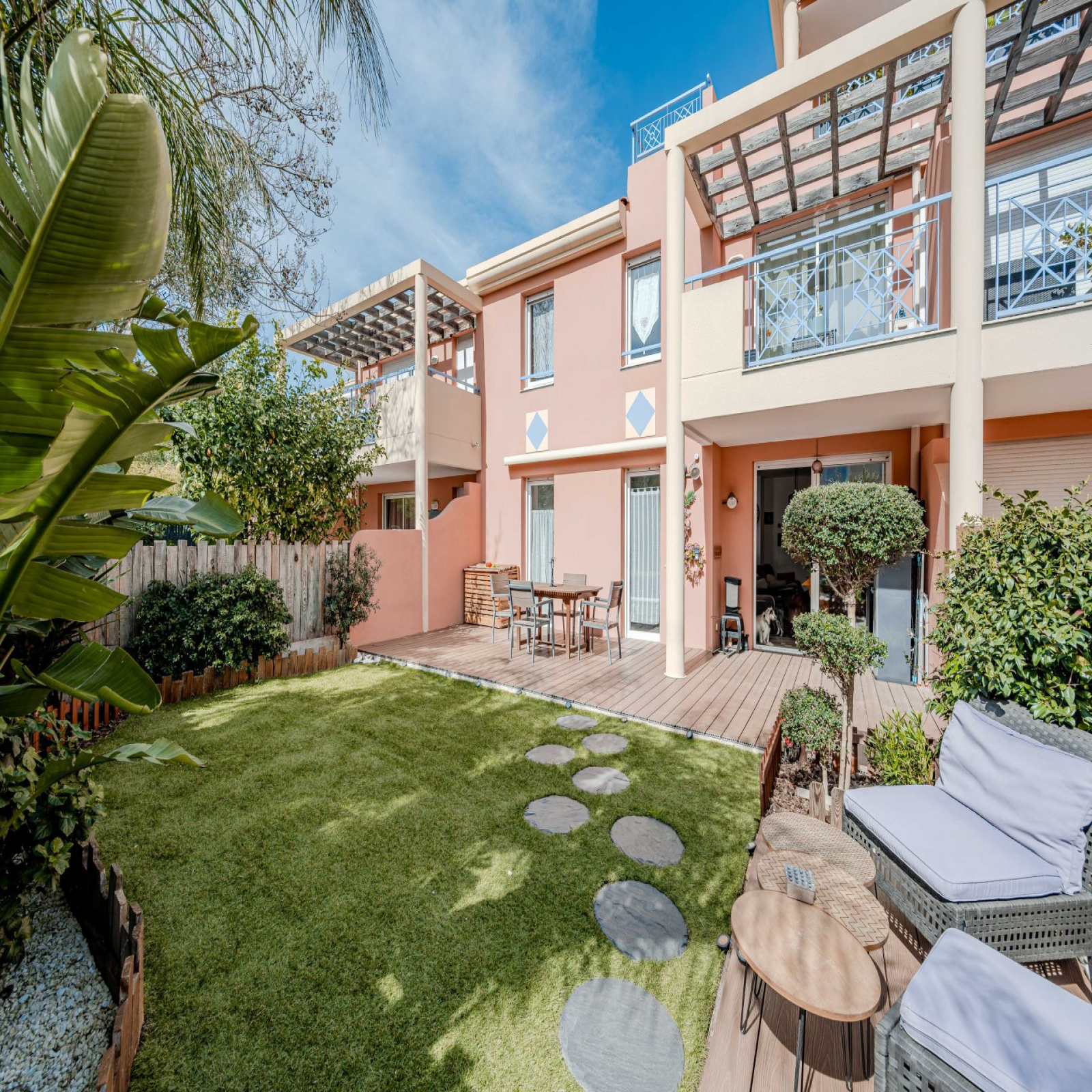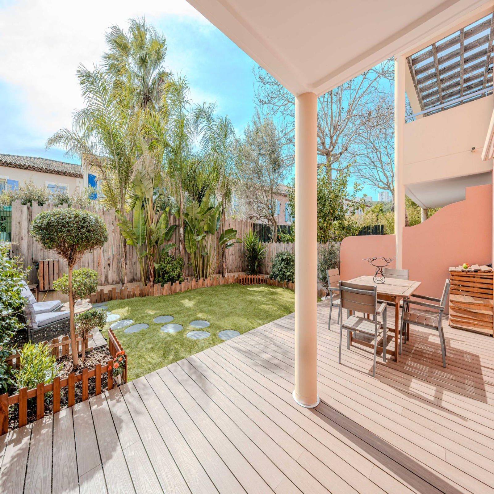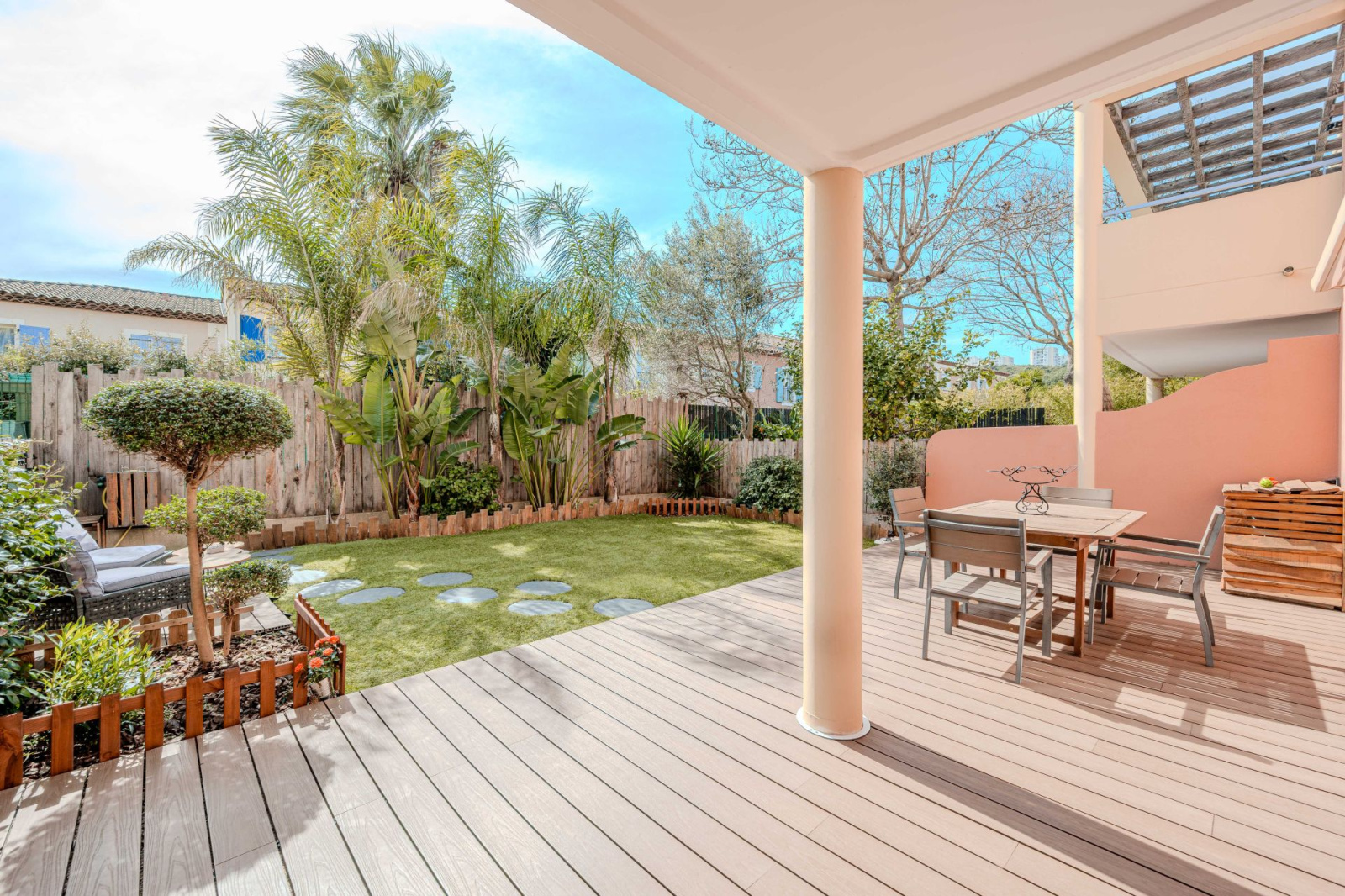 D'une superficie habitable de 43m², cet appartement se compose d'une entrée avec vestiaire, pièce de vie avec cuisine américaine équipée ouvrant sur 71m² d'extérieurs, une chambre avec rangements, salle d'eau et WC séparé.