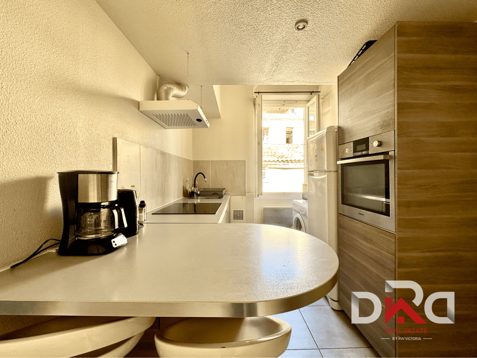 L’appartement, intelligemment agencé, offre un espace de vie optimisé. La cuisine, entièrement équipée, s’intègre parfaitement à l’ensemble et répond à tous les besoins du quotidien. À l’extérieur, vous profitez du cadre typique et pittoresque des ruelles Hyéroises.