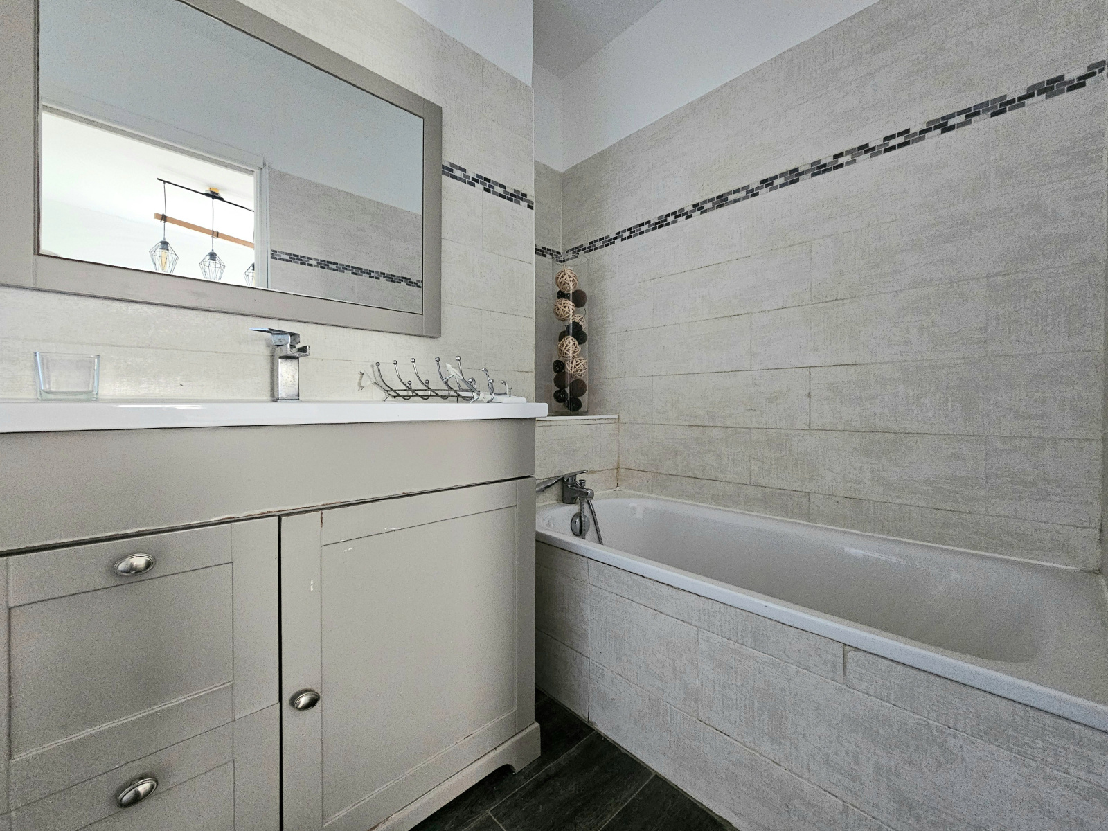 - au premier étage : un appartement T2 avec salon/séjour, cuisine, une chambre, une salle de bains avec WC