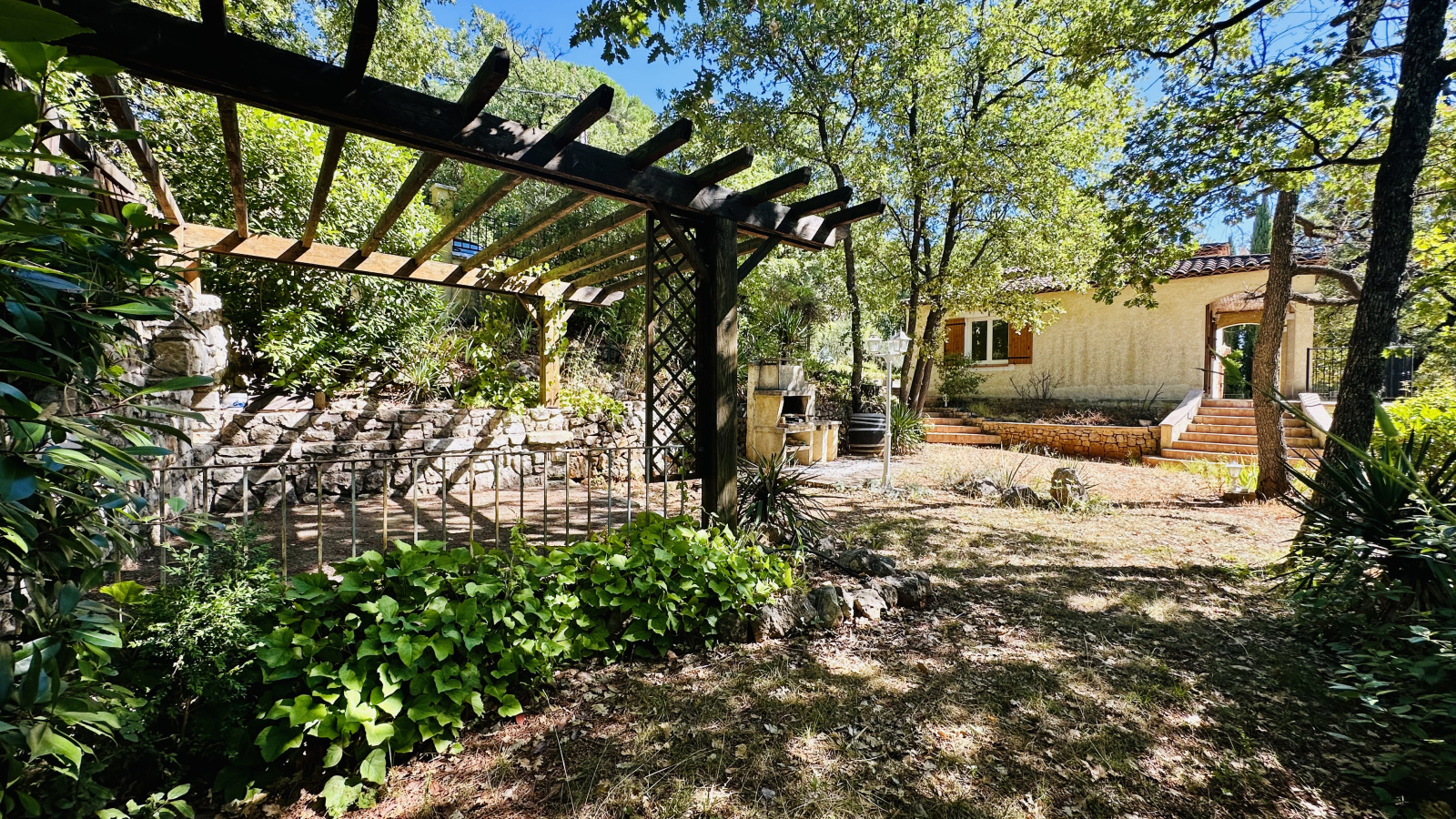 Portail électrique, rampe, grand couvert à voitures, arrosage automatique, pergola et chalet de jardin, viennent compléter cet aménagement.