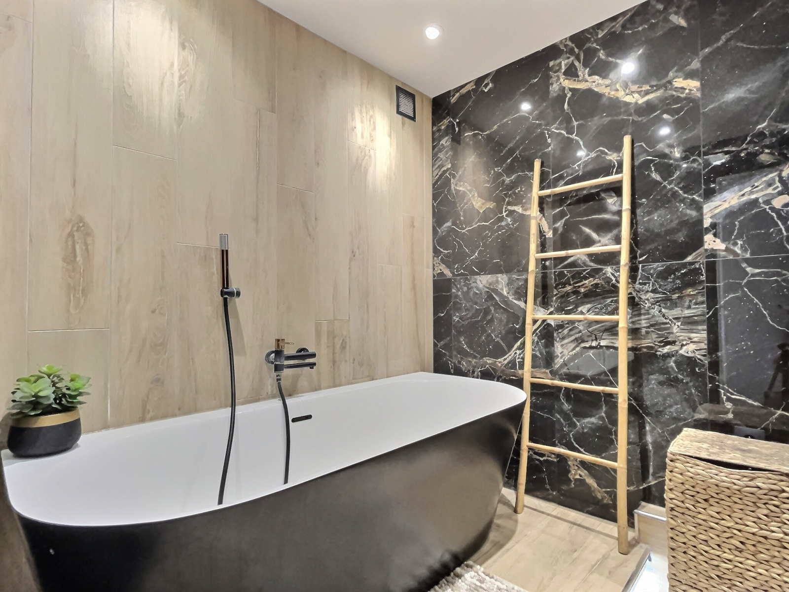 L’appartement offre deux belles chambres confortables, une salle de bain élégante avec baignoire, et de nombreux rangements astucieusement intégrés.