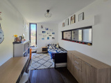 Au rez-de-chaussée, une cuisine équipée et un salon s'ouvrent directement sur une superbe terrasse en bois orientée Sud-Est. Ces espaces, baignés de lumière naturelle grâce aux ouvertures vitrées, offrent des vues captivantes sur la végétation environnante. Un dressing, une salle de bain, deux chambres, toilettes séparées, et une pièce polyvalente pour du stockage.