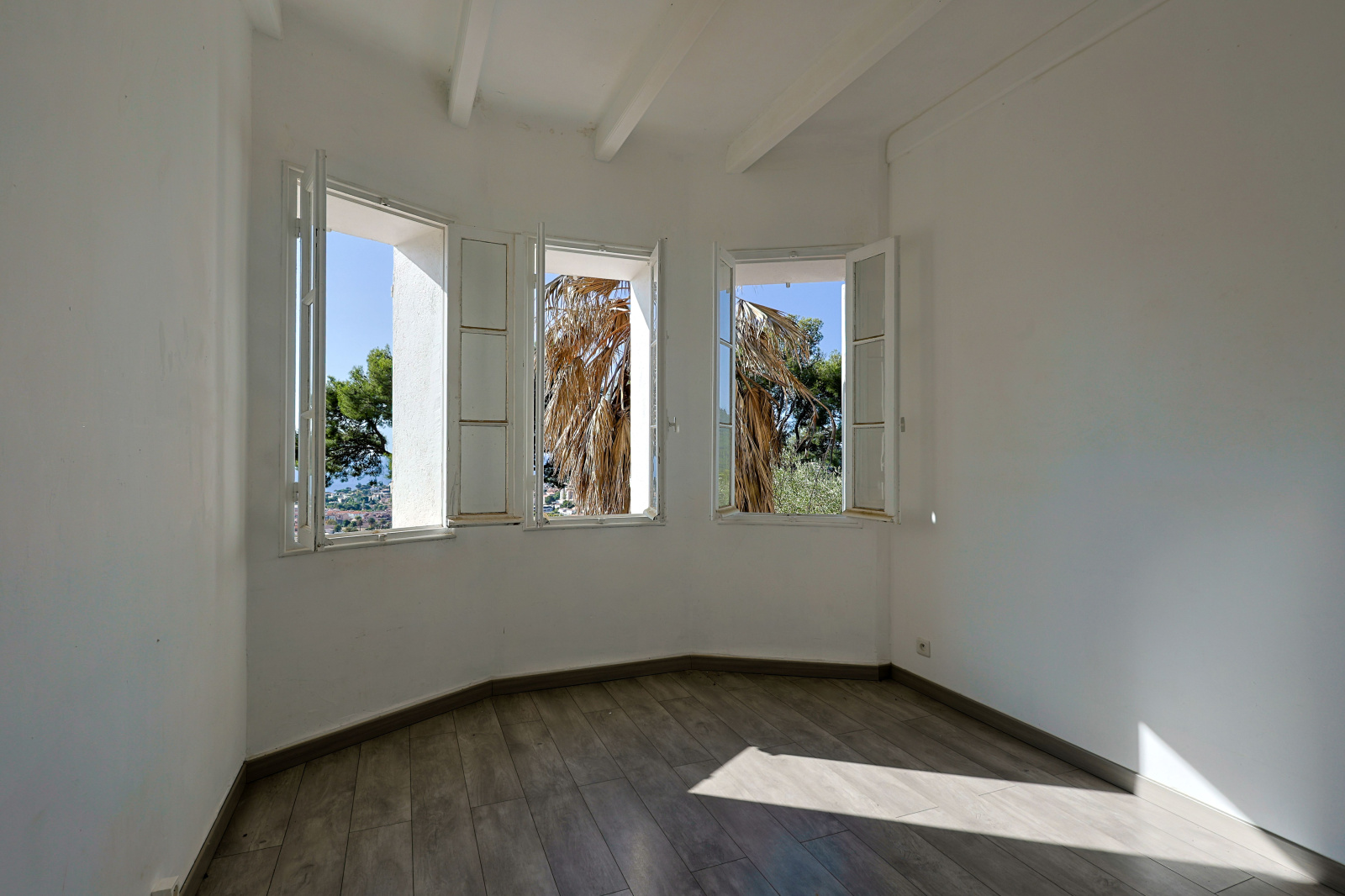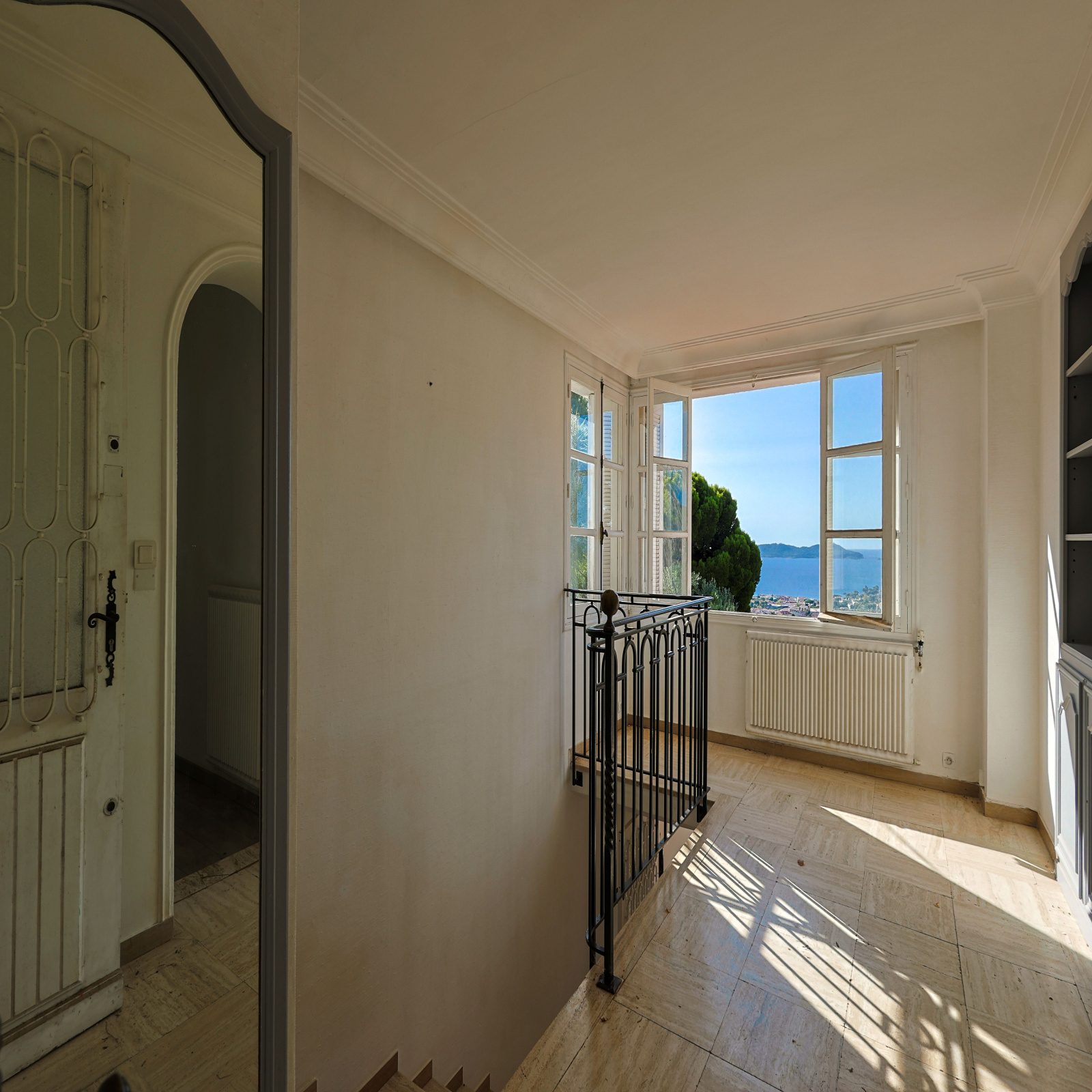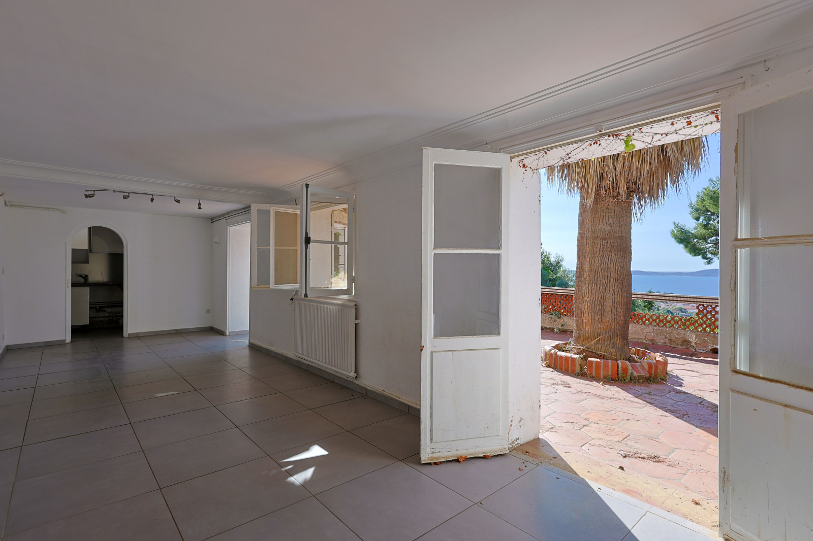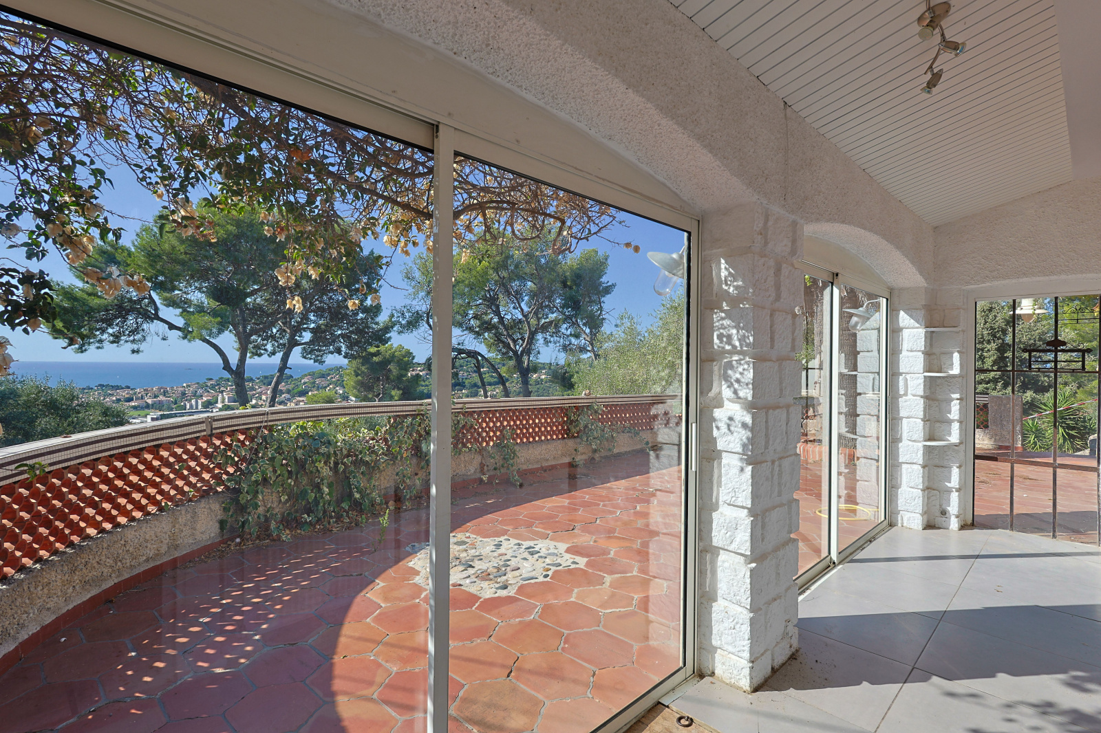 Au rez-de-villa, accessible par un escalier depuis l'entrée, vous trouverez une belle pièce de vie baignée de lumière naturelle, s’ouvrant sur une terrasse offrant une vue panoramique sur la mer. La cuisine attenante, complète cet étage.