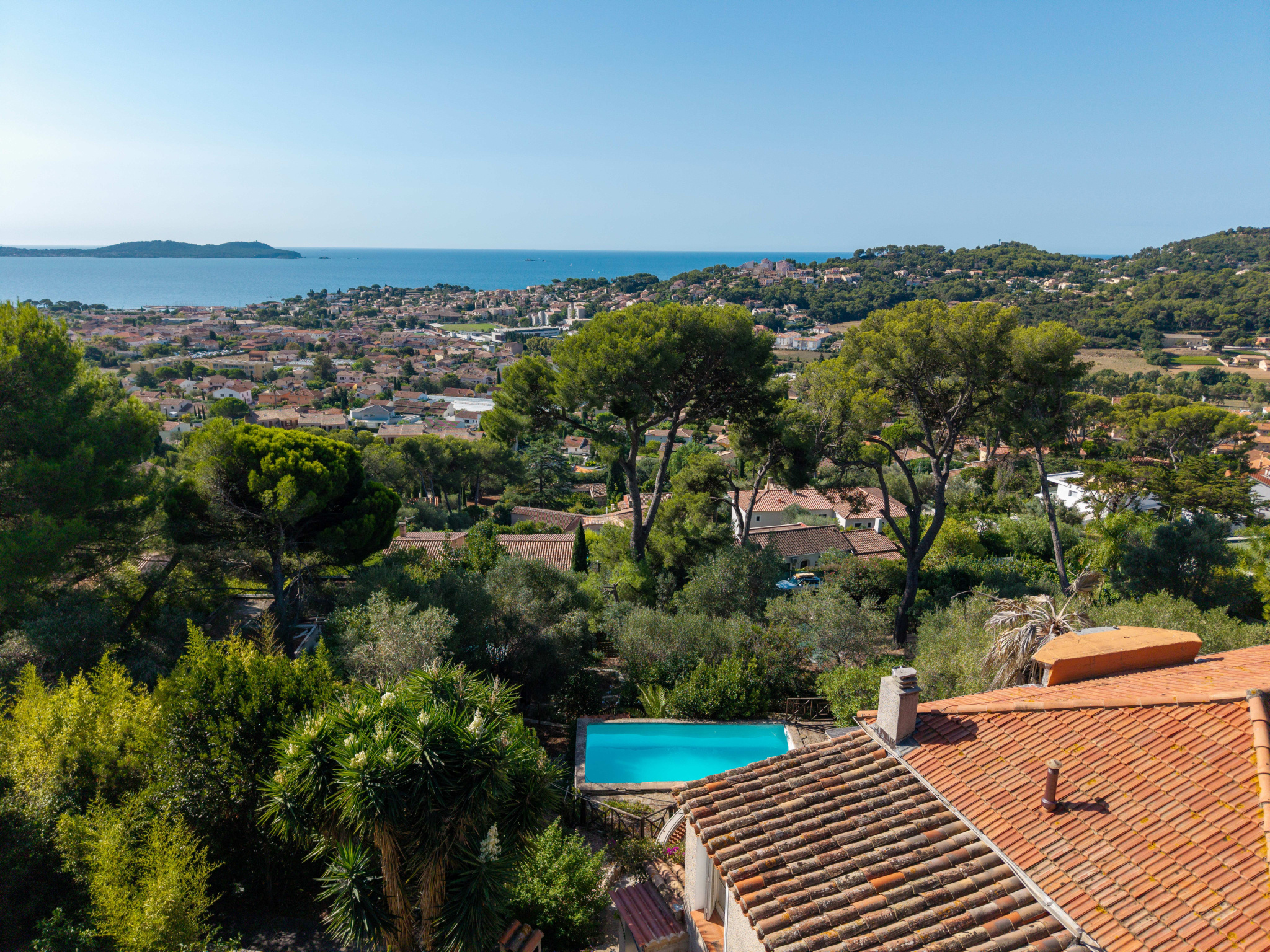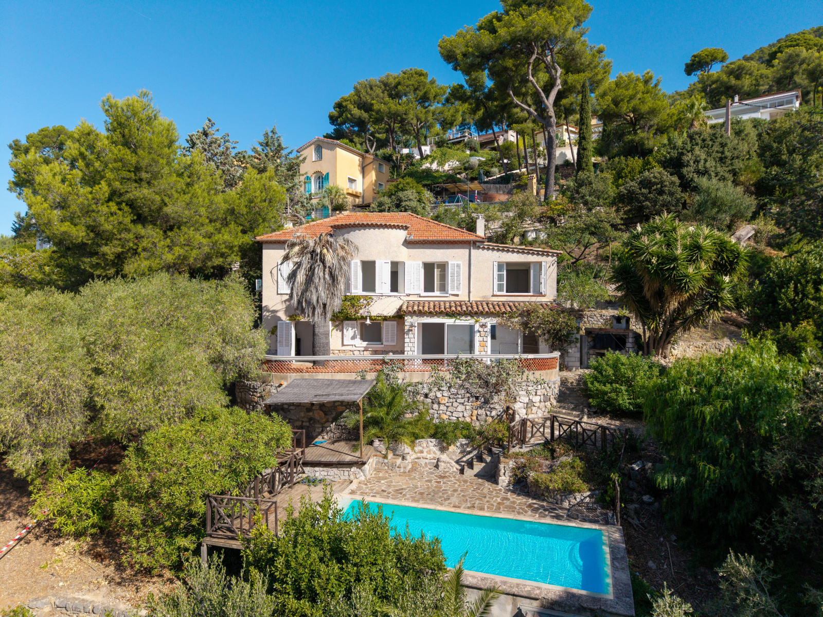 Le terrain en restanques ajoute au cachet de la propriété et permet une belle exploitation extérieure. La piscine est située sur une grande terrasse, accessible par un escalier, créant un véritable espace de détente avec vue mer.