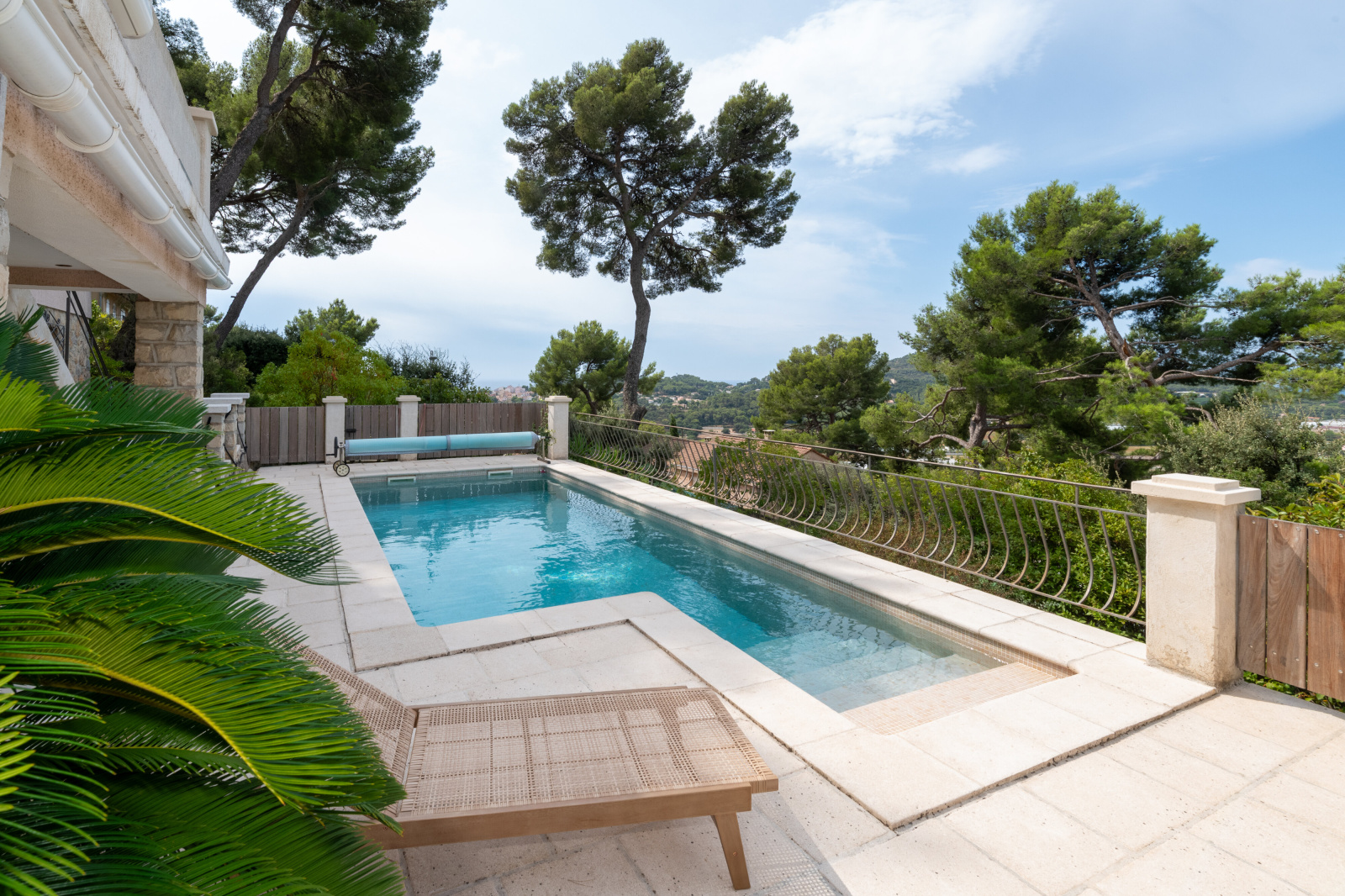 Nichée dans l’un des quartiers les plus prisés de Carqueiranne, cette élégante villa séduit par son cadre calme et sa vue panoramique à 180° sur la mer et les collines environnantes. Depuis ses terrasses, vous pourrez admirer chaque soir de splendides couchers de soleil.